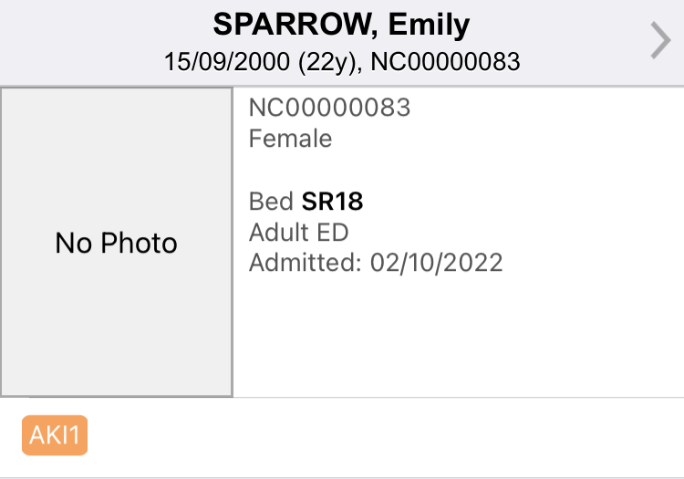 Nervecentre adds an red patient tag ‘AKI 2’ to the patient banner.