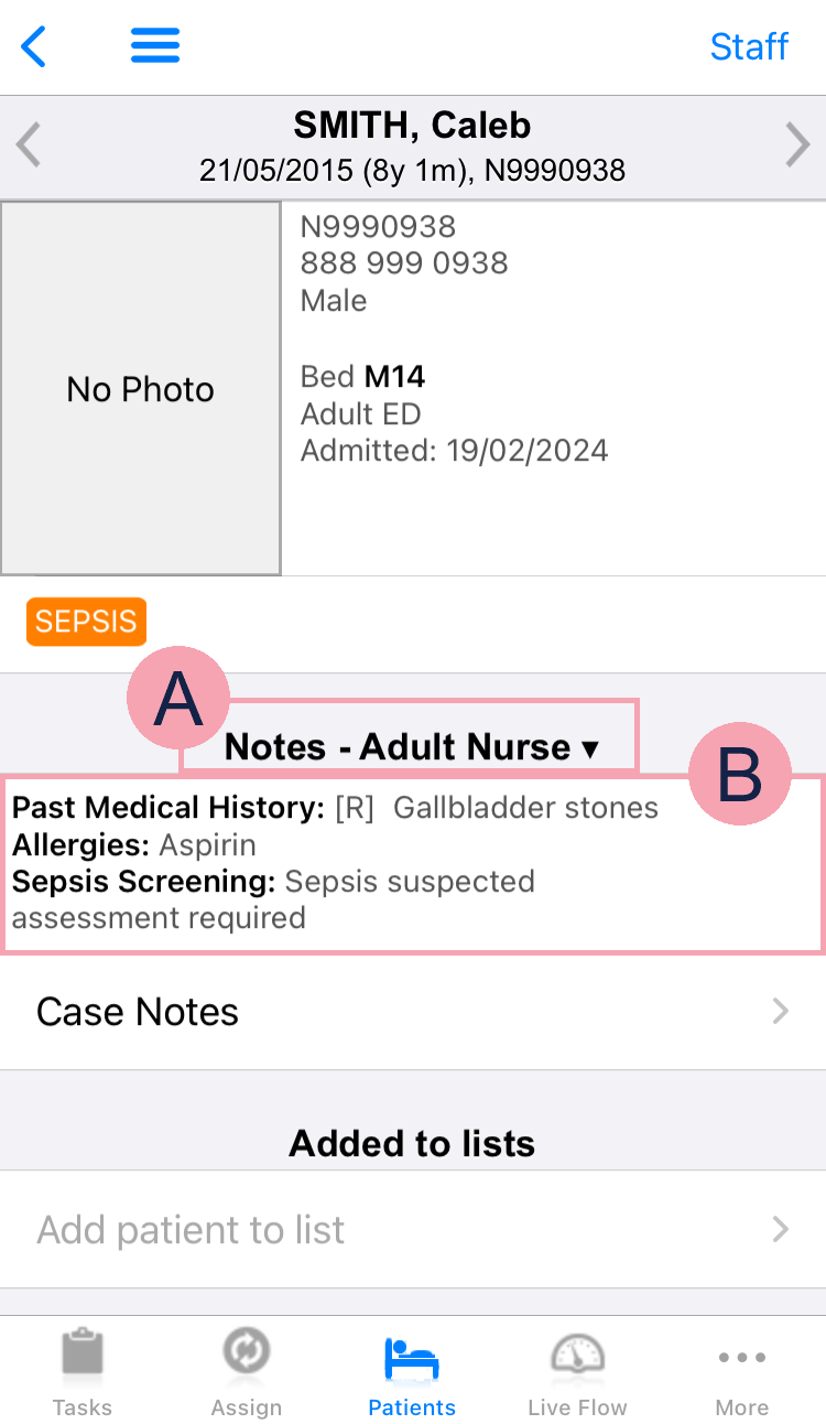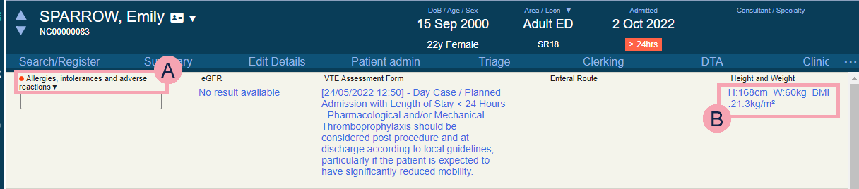 When a clinical note is updated, Nervecentre might add a patient tag to the patient's record. For example, when Nervecentre updates the clinical note 'AKI' to 'AKI Stage 1', the patient tag 'AKI 1' appears in the patient's record.