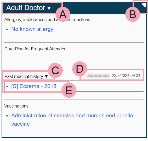 The name of the clinical note. is shown next to clinical notes that are not in scope. Read more about out of scope clinical notes Mouseover the name and select to view the history of the clinical note, or to clear the clinical note. |