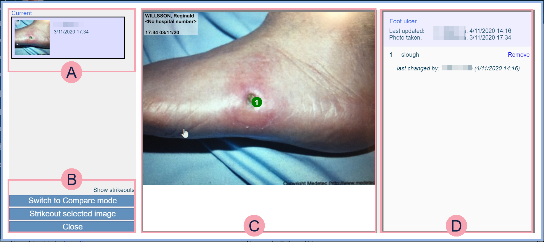 Shows the name of the image, the user who took the image, when the image was taken, the user who updated the image, and when the image was updated. Select the name of the image to enter a new name. Read more about editing the name of an image Select a number in the list to add an annotation. Select Remove to remove an annotation. |