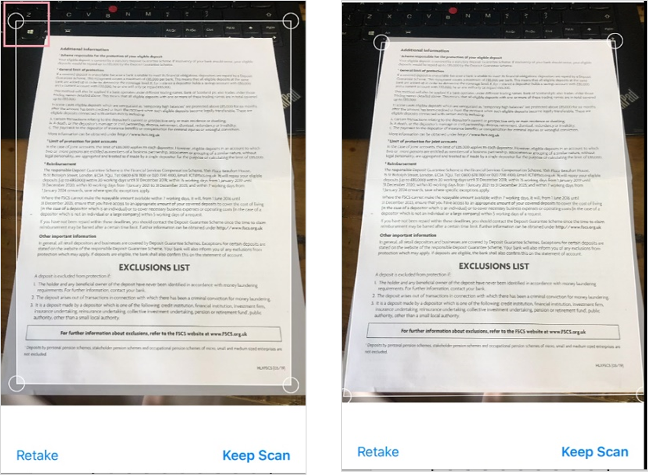 If the blue or grey area doesn’t appear, try moving your mobile device to a different position. For best results, hold your mobile device flat and directly over the document.