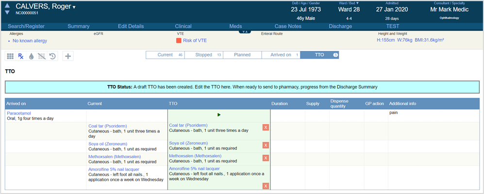 This shows all medications added to the TTO. TTO Status guides you on how to progress the TTO.