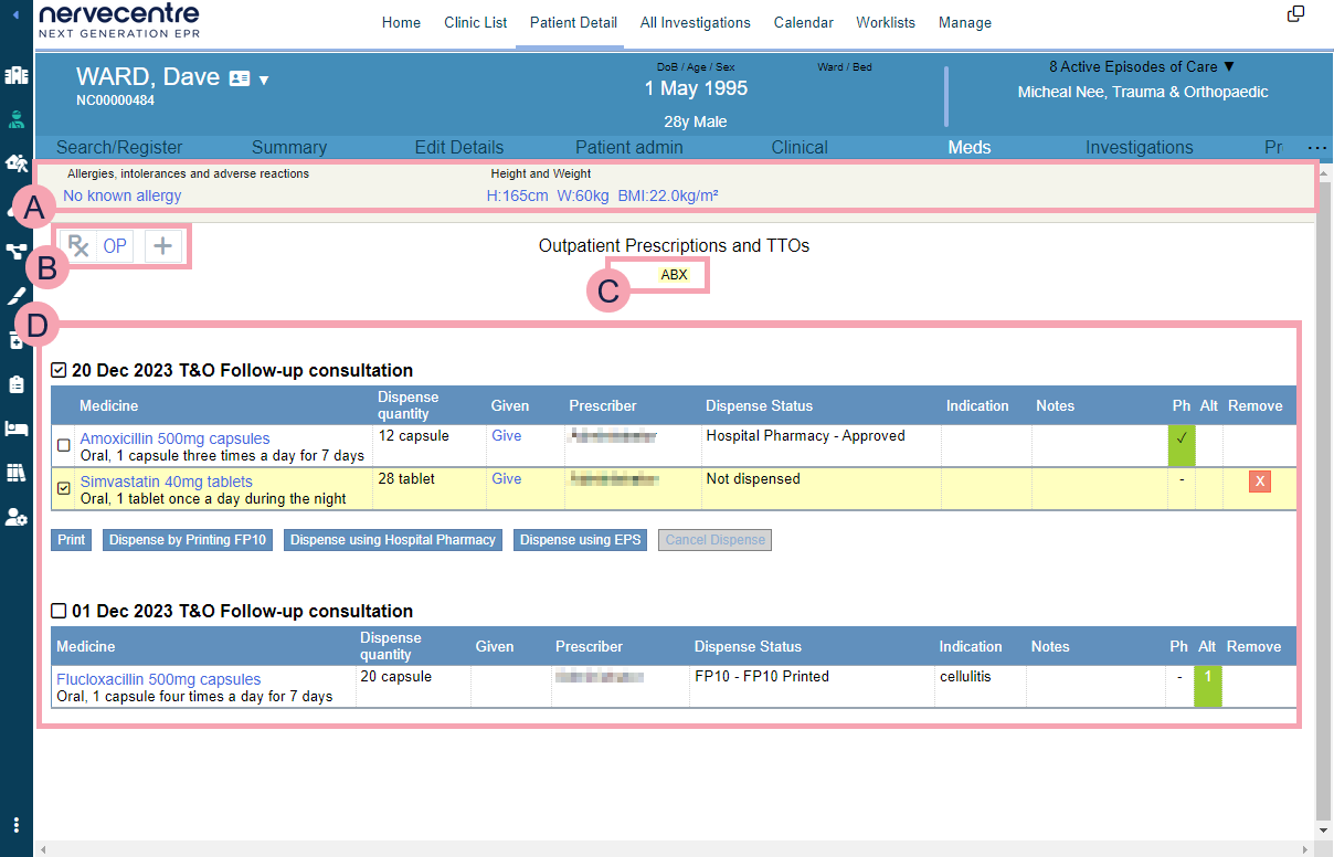 Select OP to view the outpatient prescription list, then select next to the appointment name.