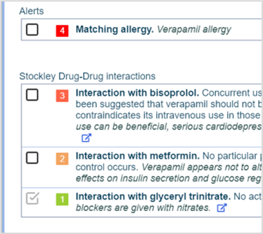 There are four levels of alert that can appear when you sign a prescription. Alerts capture all clinical decision support, except interactions between drugs or drug classes. Stockley Drug-Drug Interactions shows interactions between drugs or drug classes.