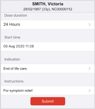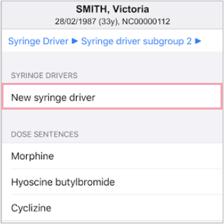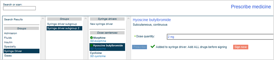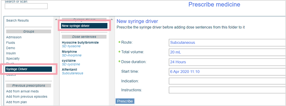 Select a medication for the syringe driver, select or enter the required details, and then select Prescribe.