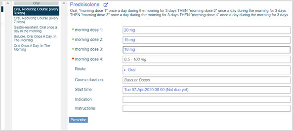 “Oral ‘morning dose 1’ once a day during the morning for 3 days THEN ‘morning dose 2’ once a day during the morning for 3 days”. When prescribing the medication, you can enter the dose needed for ‘morning dose 1’ and ‘morning dose 2’.