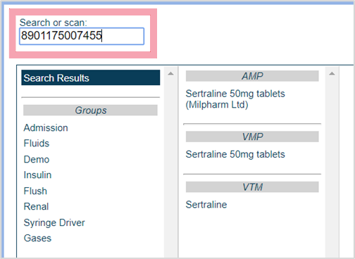 Select an option from Formulary VTMs for medications, or Fluids for fluids.