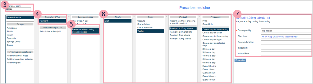 When you prescribe without a dose sentence, you receive only limited clinical decision support. You prescribe by answering a set of mandatory questions, for example, the route and licenced form of the medication.