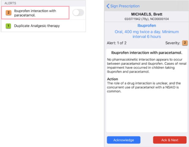There are four levels of alert that can appear when you sign a prescription. Organisations can configure their alerts and choose whether alert levels 1 to 3 are pre-acknowledged or need acknowledgement. Level 4 alerts need acknowledgement and justification.