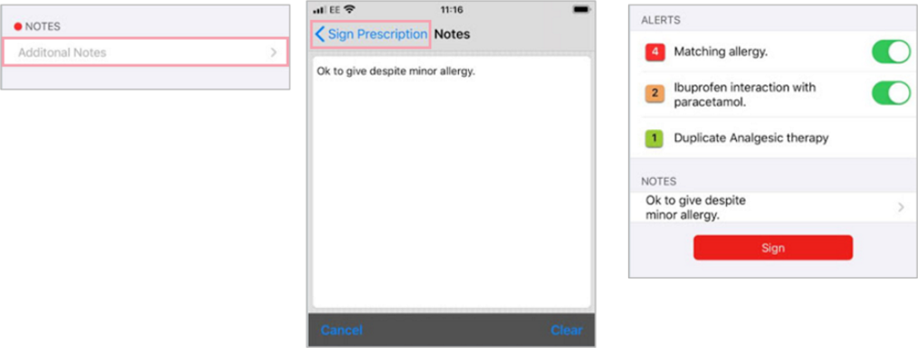 To sign the prescription, finish acknowledging alerts, enter any notes, and select Sign.