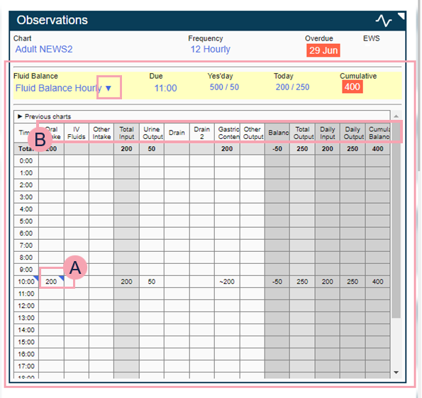 From the Observations summary, select anywhere in the row for fluid balance.
