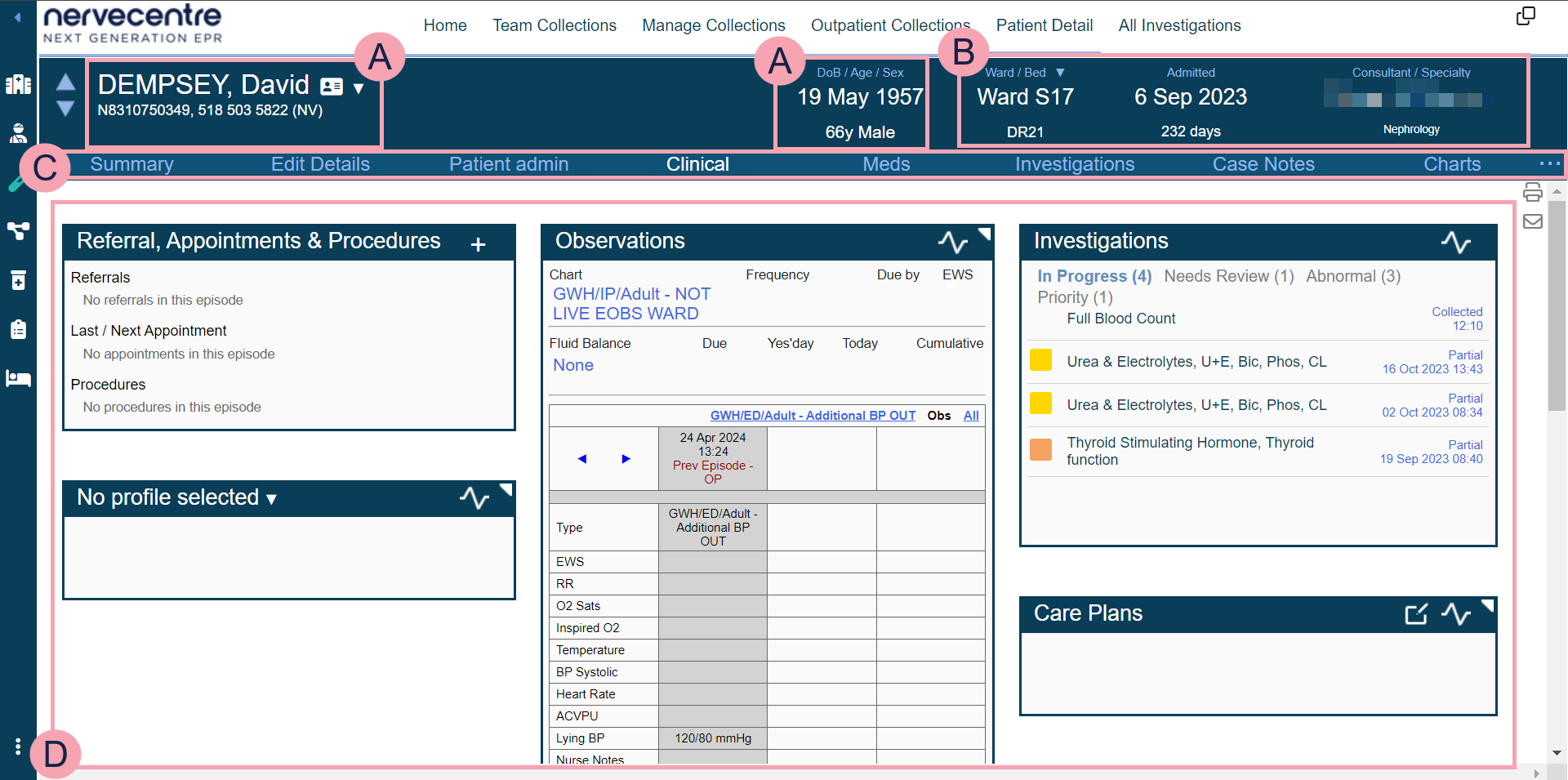 Shows detailed information about the patient. The information shown depends on the area you select. By default, Clinical is shown. Clinical shows you summaries of patient information such as observations, clinical notes, and care plans. |
