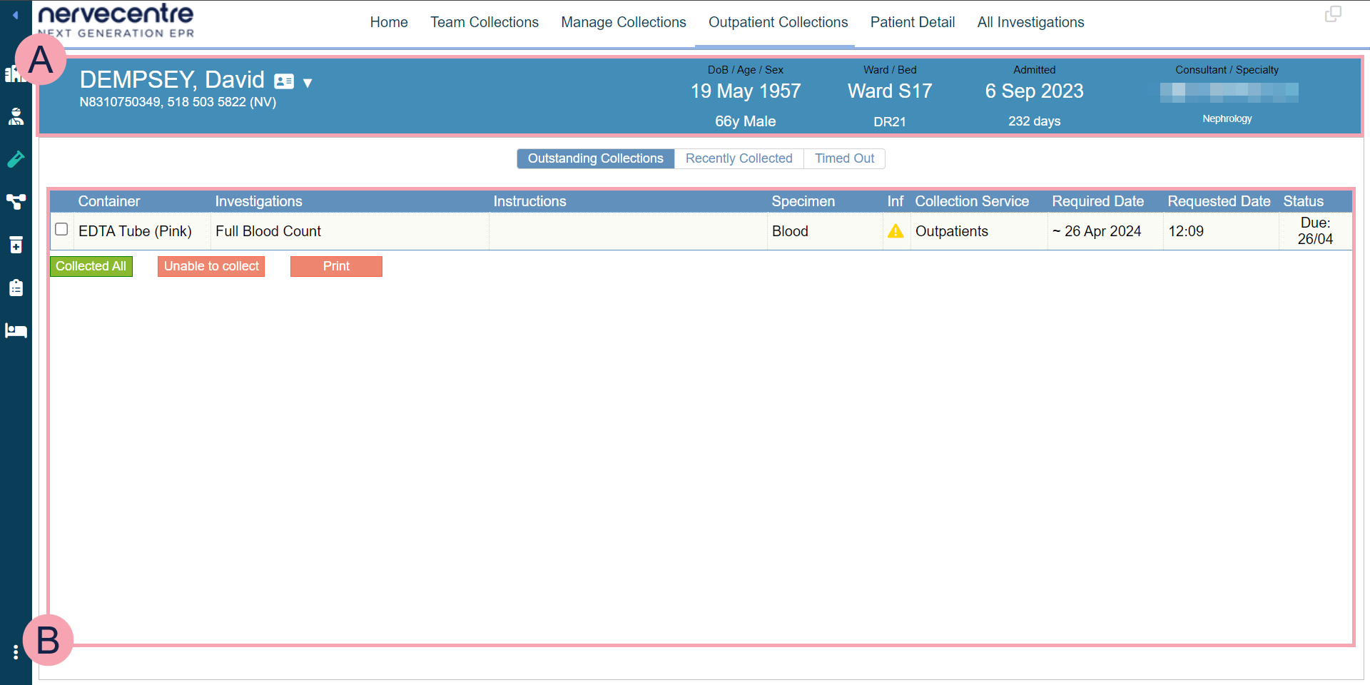 Shows collections for outpatients. You can select an outpatient to view collections for them. You can view their outstanding collections, recently collected samples, and collections that have timed out. You can record when you have collected a sample. |