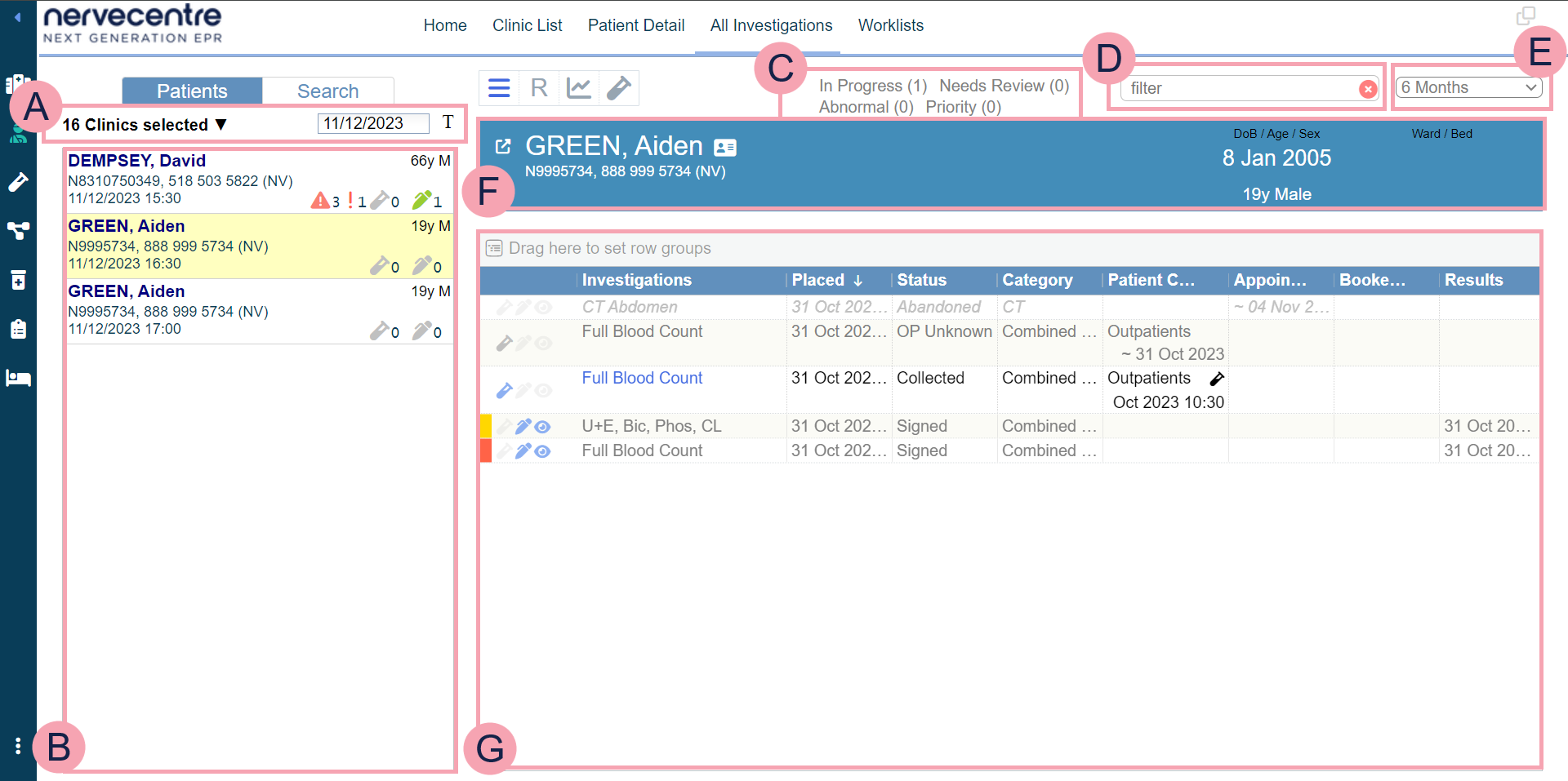 From Outpatients > All Investigations, you can search for and view information about investigations for patients in a clinic, or other patients who meet your search criteria.