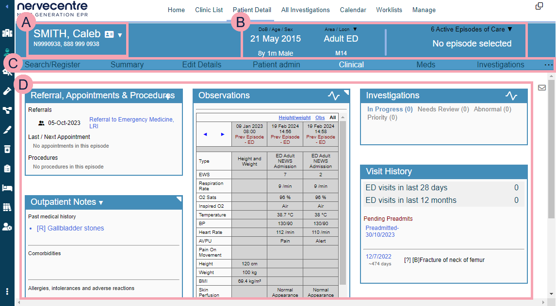 Shows detailed information about the patient. The information shown depends on the area you select. By default, Clinical is shown. Clinical shows you summaries of patient information such as observations, clinical notes, and investigations. |