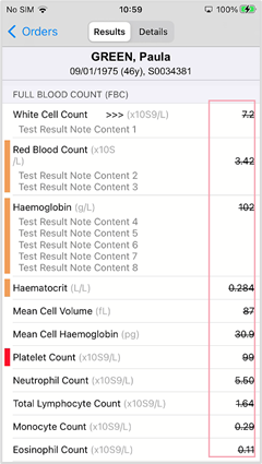 If you strike out all results in an order, the status of the order updates to 'Sys Cancelled'. For example, you view an order that contains the results of a full blood count and an INR. If you only strike out all the results in the full blood count, the status doesn't change. If you strike out all the results in the full blood count and in the INR, the status changes to 'Sys Cancelled'.