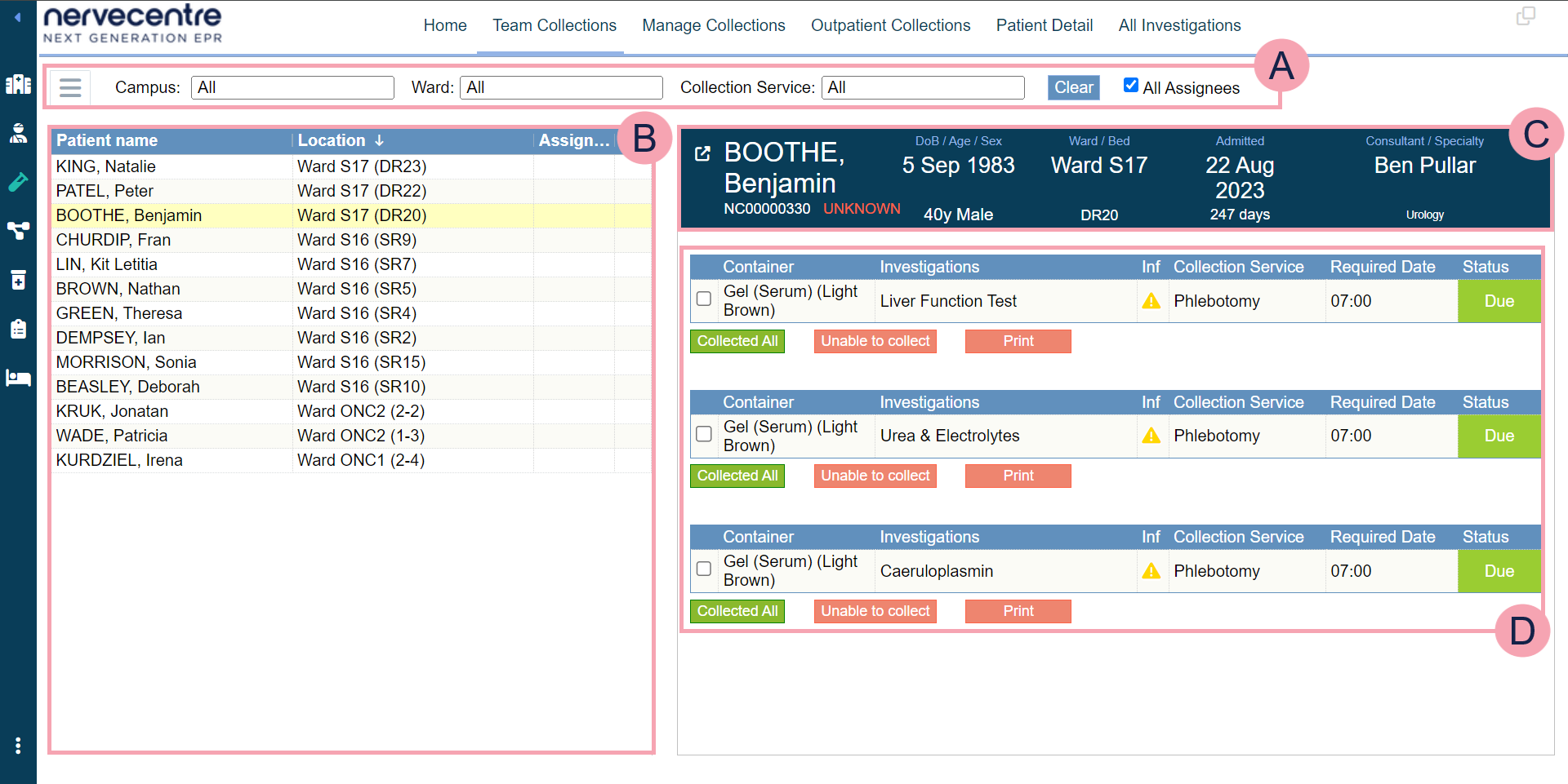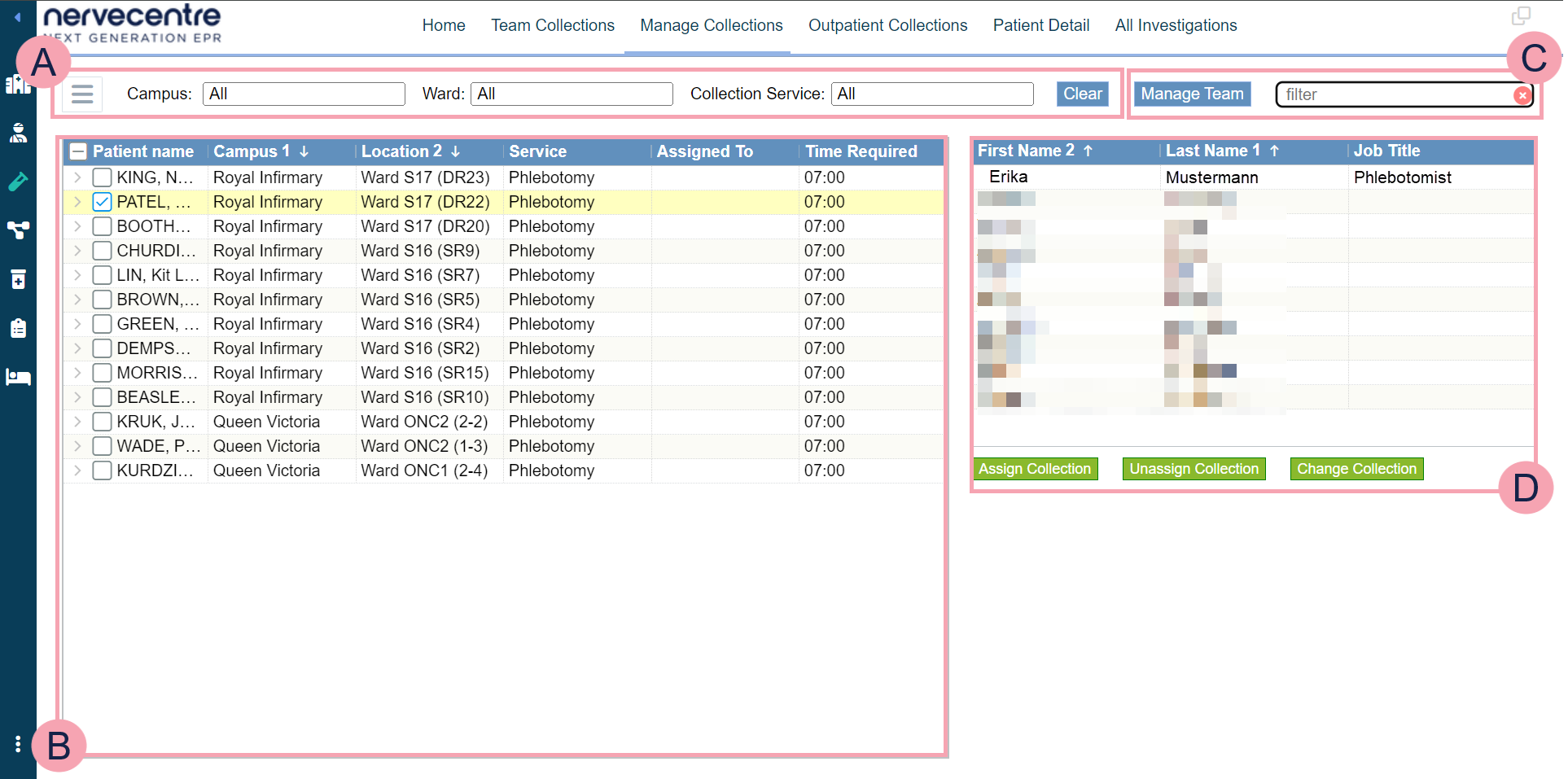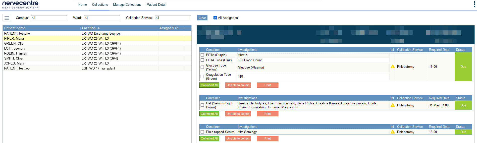Depending on your permission, you can assign and unassign collection tasks. For example, phlebotomy managers can assign sample collection tasks to their team. If a team member can't complete a collection task, a phlebotomy manager can reassign the task to another team member.