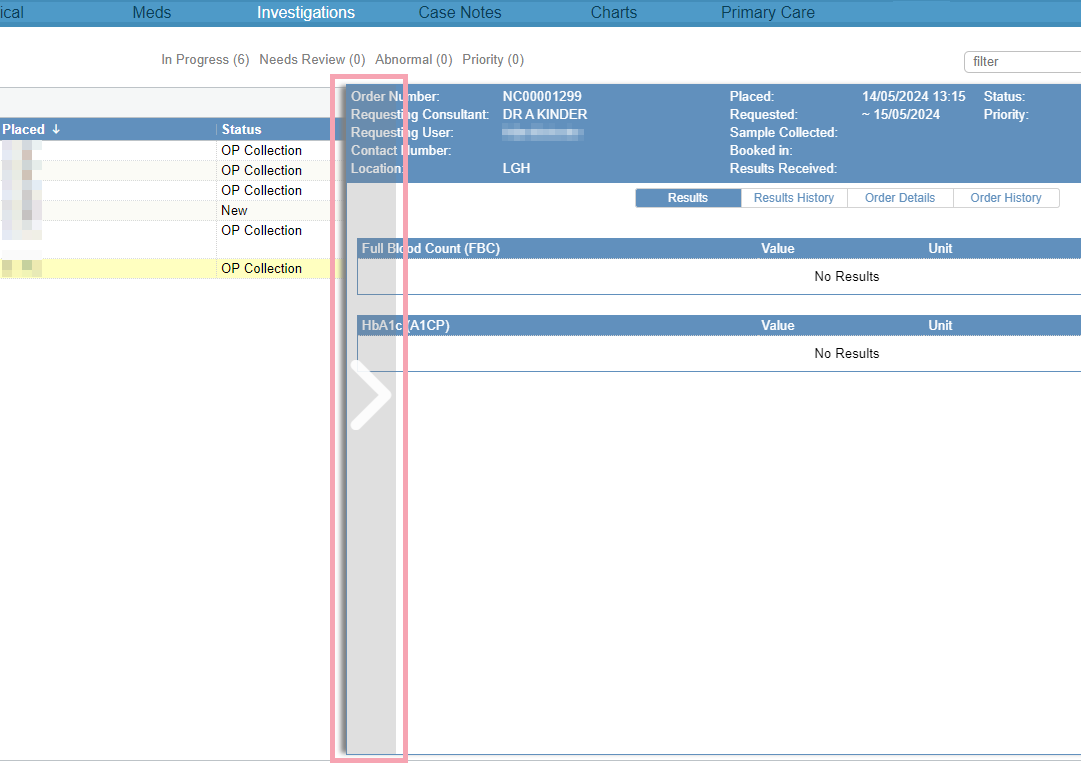 On a desktop, you can view details about an order A request to perform one or more services against one or more samples taken from the same patient, requested at the same time and with the intention that the samples are taken at the same time. for an outpatient. You can also view the history of an order.