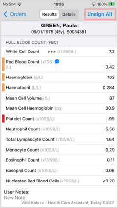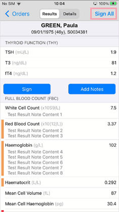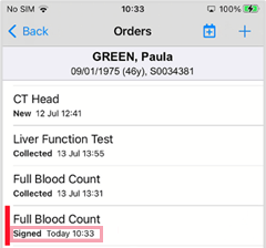 To show that you've seen and acknowledged results, you can sign off individual results and full orders on a mobile or desktop.