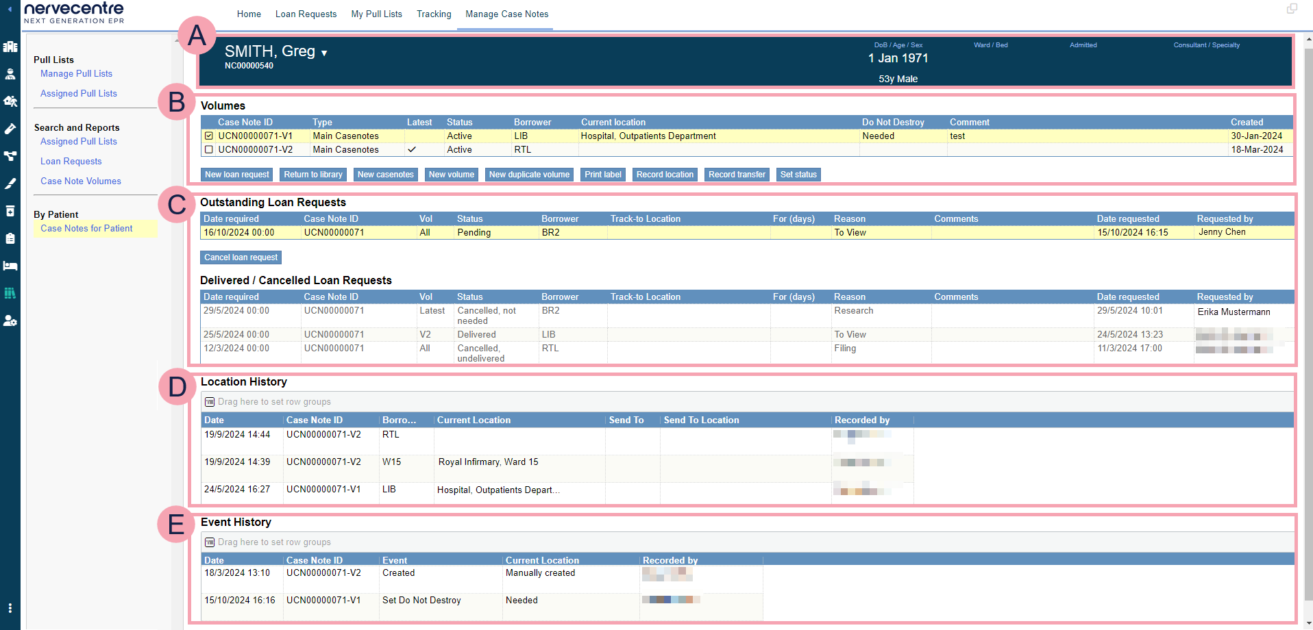 Shows the location history of the patient's case note volumes. |