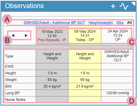 From Outpatients > Patient Detail > Clinical > Observations, you can view observations for a patient.