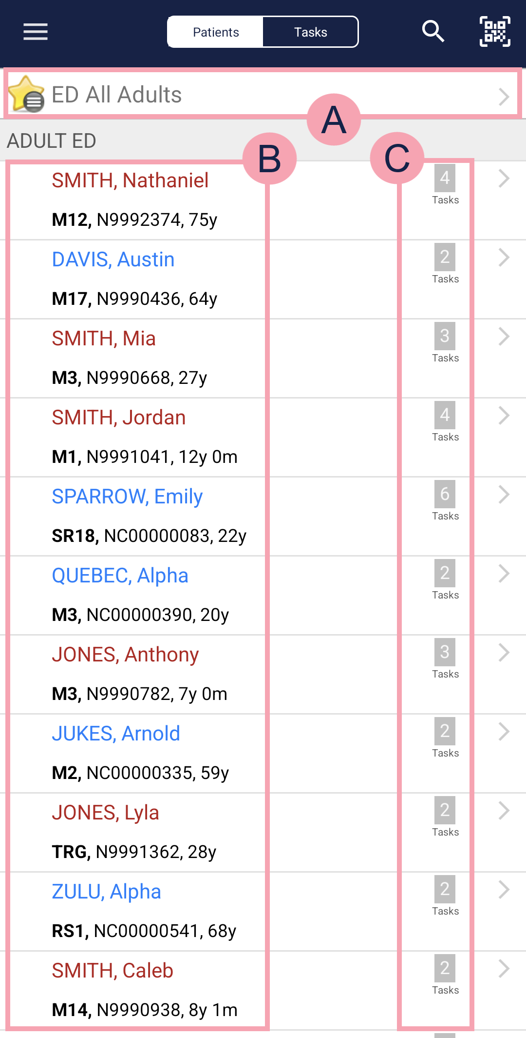 Shows the list of patients. Patient names that sound similar to each other are red. Select a patient to open their patient record. Read more about viewing patient details Select and hold on the name of a patient to scan a patient's QR code. |