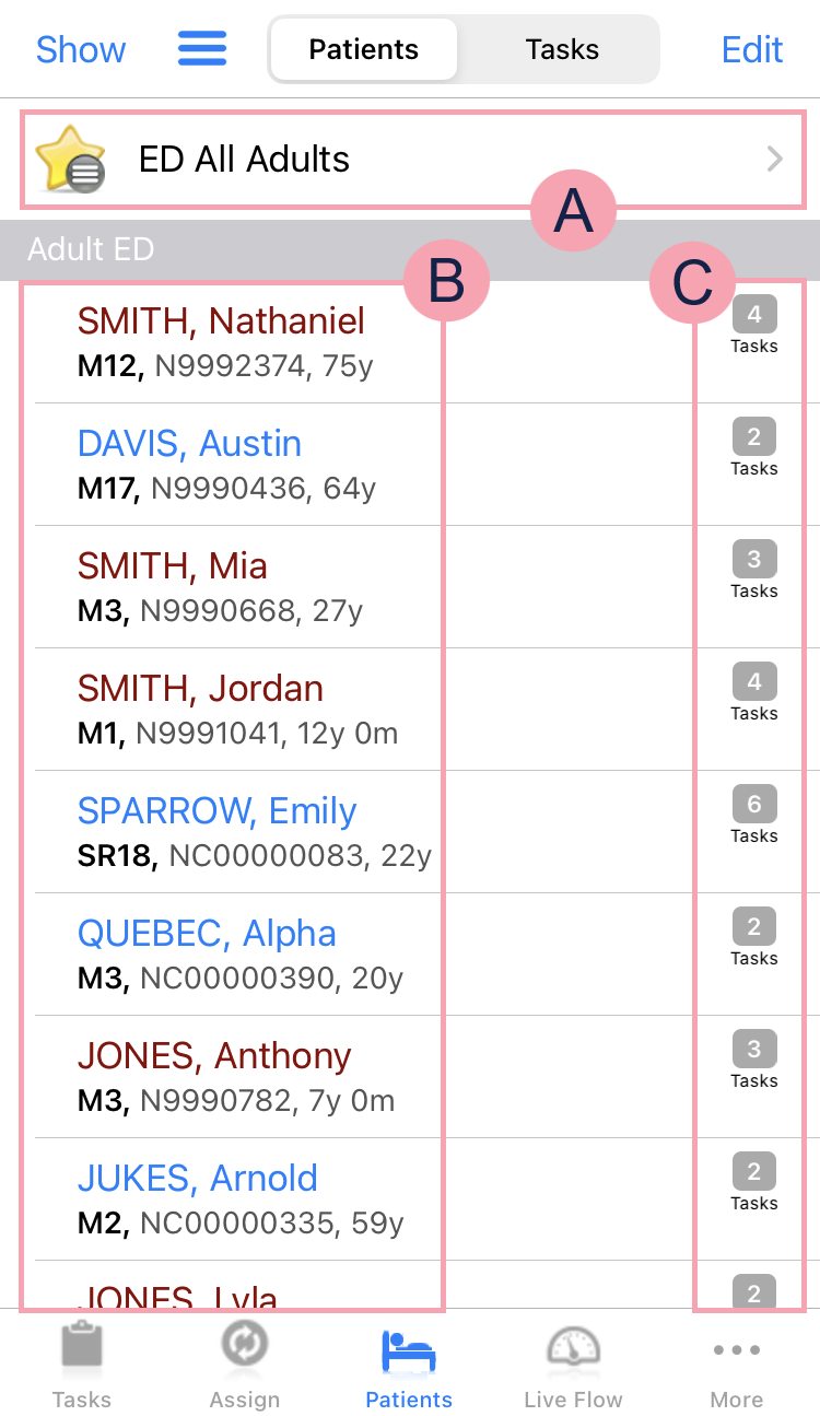 Shows the list of patients. Patient names that sound similar to each other are red. Select a patient to open their patient record. Read more about viewing patient details Select and hold on the name of a patient to choose the information that is shown on the patient list. Read more about choosing information to view on a patient list |