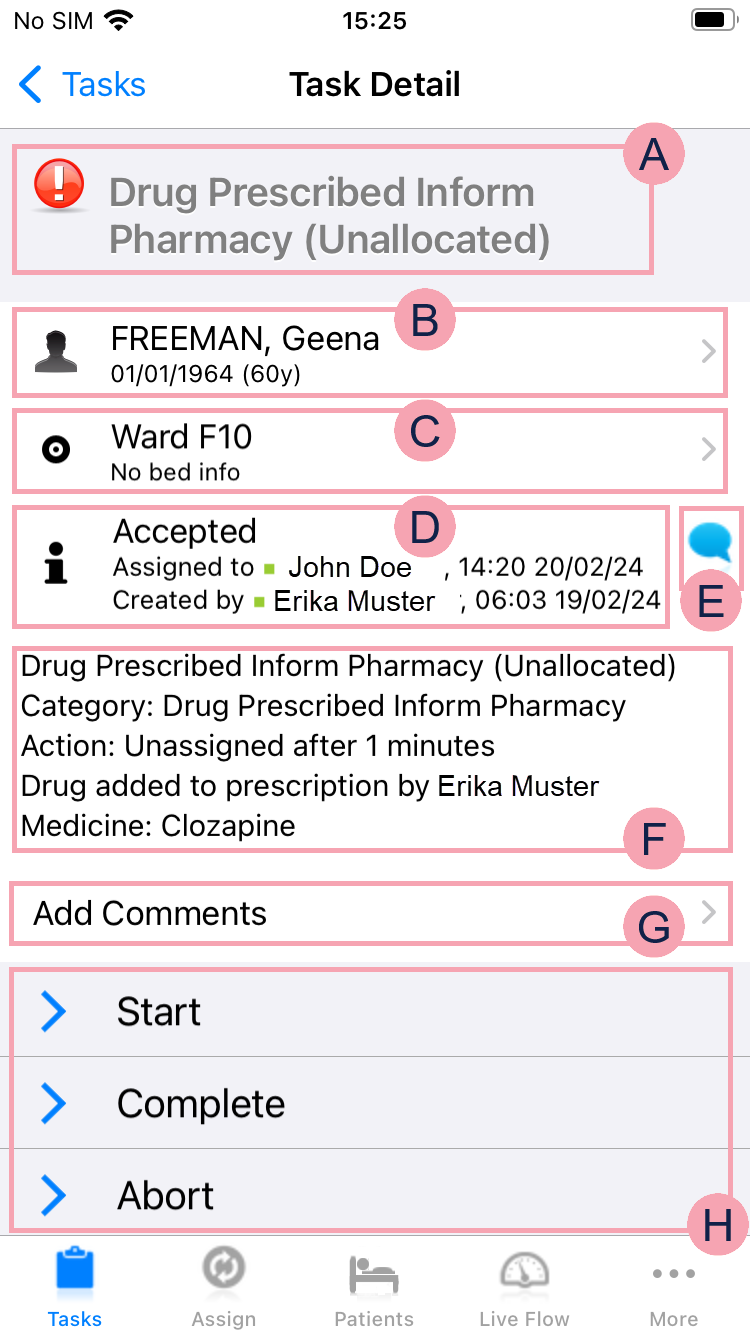 Viewing information about a task for a specific patient